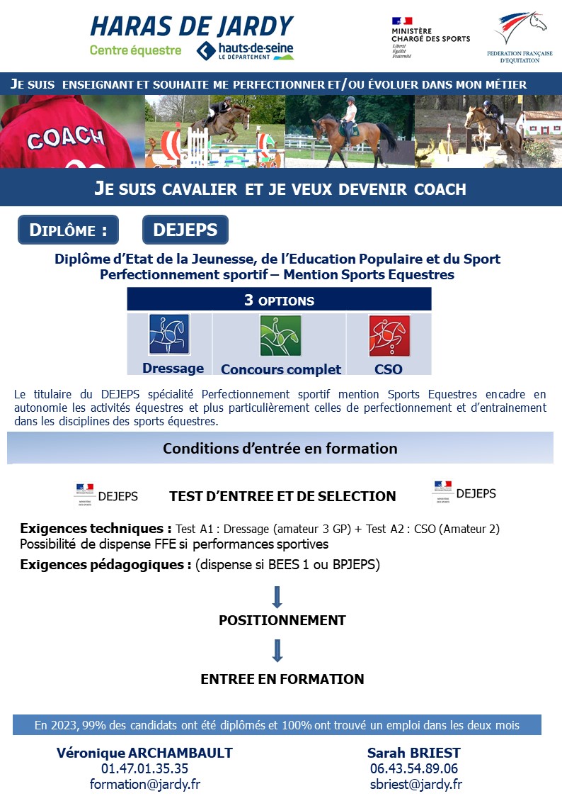 Le titulaire du DEJEPS conçoit, coordonne et met en oeuvre un projet de perfectionnement : progression technique et entraînement du couple, formation, travail et suivi du cheval, organisation de compétition.
