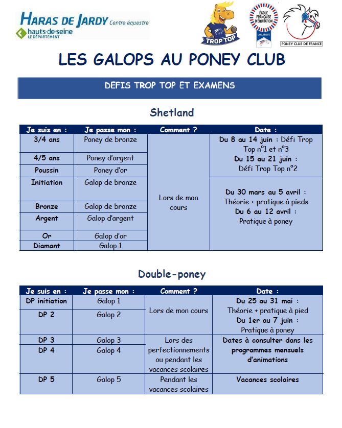 Pour faciliter l’apprentissage du poney par rapport aux âges et aux pré- requis des enfants, la Fédération Française d’Equitation a mis en place de nouveaux programmes, les « Galops et les Galops Poneys ». Ce nouveau dispositif permet d’accompagner les enfants dans leur parcours de cavalier. Chaque diplôme obtenu apparaîtra sur la licence une fois validée.