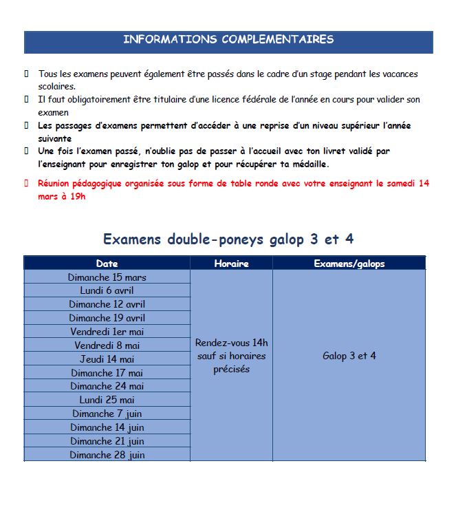 - Les galops 3 et 4 se passent lors de sessions d’examen dédiées