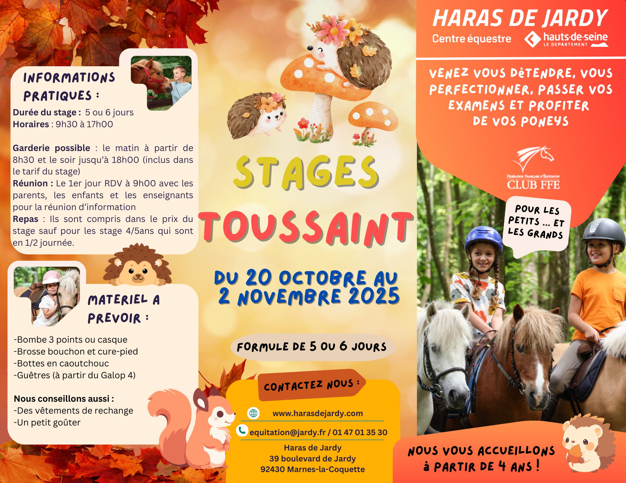 Les stages se déroulent de 9h30 à 17h00. Pour les enfants de 4 et 5 ans, les stages s’effectuent par demi-journée : matin de 9h30 à 12h30 ou après midi de 14h à 17h.