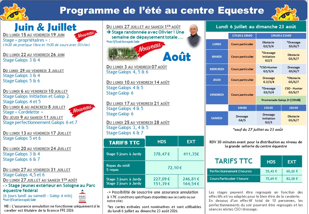 - La restauration des stages : 65.05 euros les 5 repas du midi